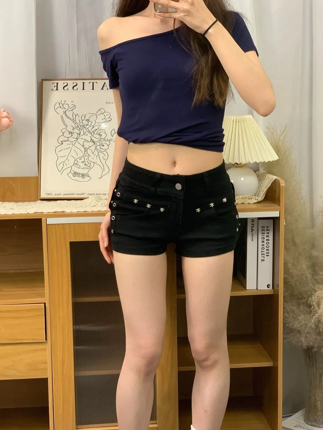 Sexy American Y2K Short Shorts Women's Design Sense Rivet Slim A- Line Wrap Hot Pants Low Waist Denim Super Short Cotton Blend